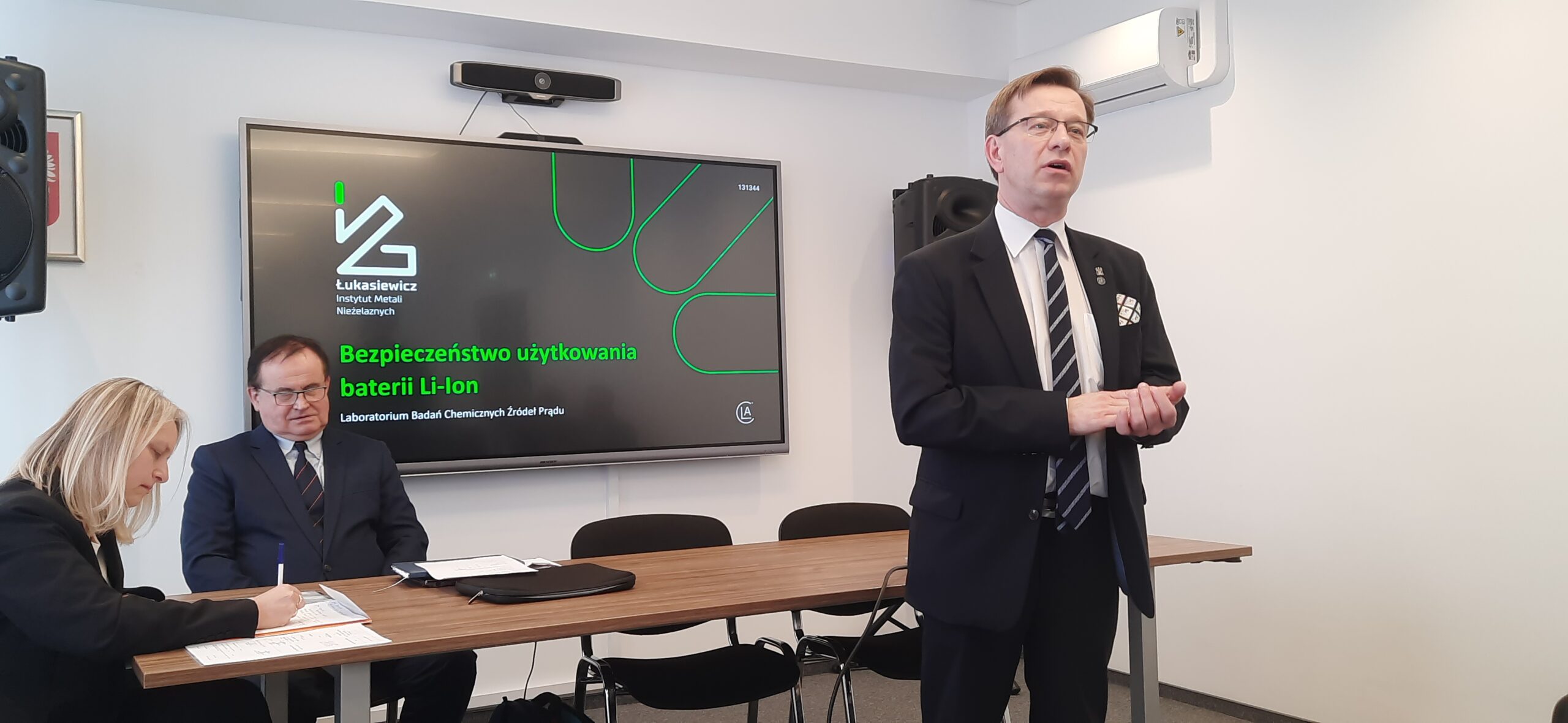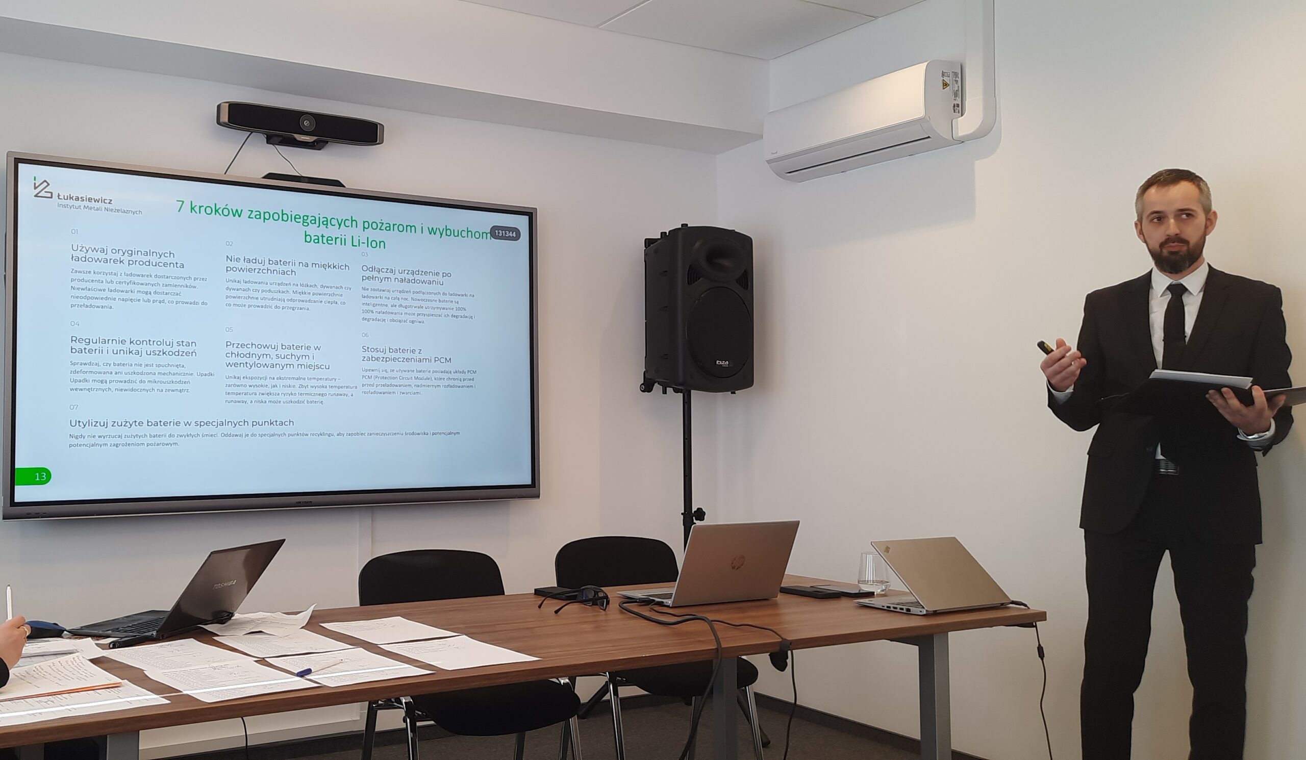 W części naukowej posiedzenia Pan mgr Kamil Frączak, reprezentujący Laboratorium Badań Chemicznych Źródeł Prądu, wygłosił referat pt. „Bezpieczeństwo użytkowania baterii Li-Ion”. Prelegent szczegółowo omówił m.in. główne zagrożenia wynikające z eksploatacji nowoczesnych systemów magazynowania energii, mechanizmy i najczęstsze przyczyny awarii ogniw oraz podał „7 kroków zapobiegających pożarom i wybuchom baterii Li-Ion”. Wystąpienie zakończyło się ożywioną dyskusją skupioną wokół standardów bezpieczeństwa chemicznych źródeł prądu w kontekście regulacji prawnych.